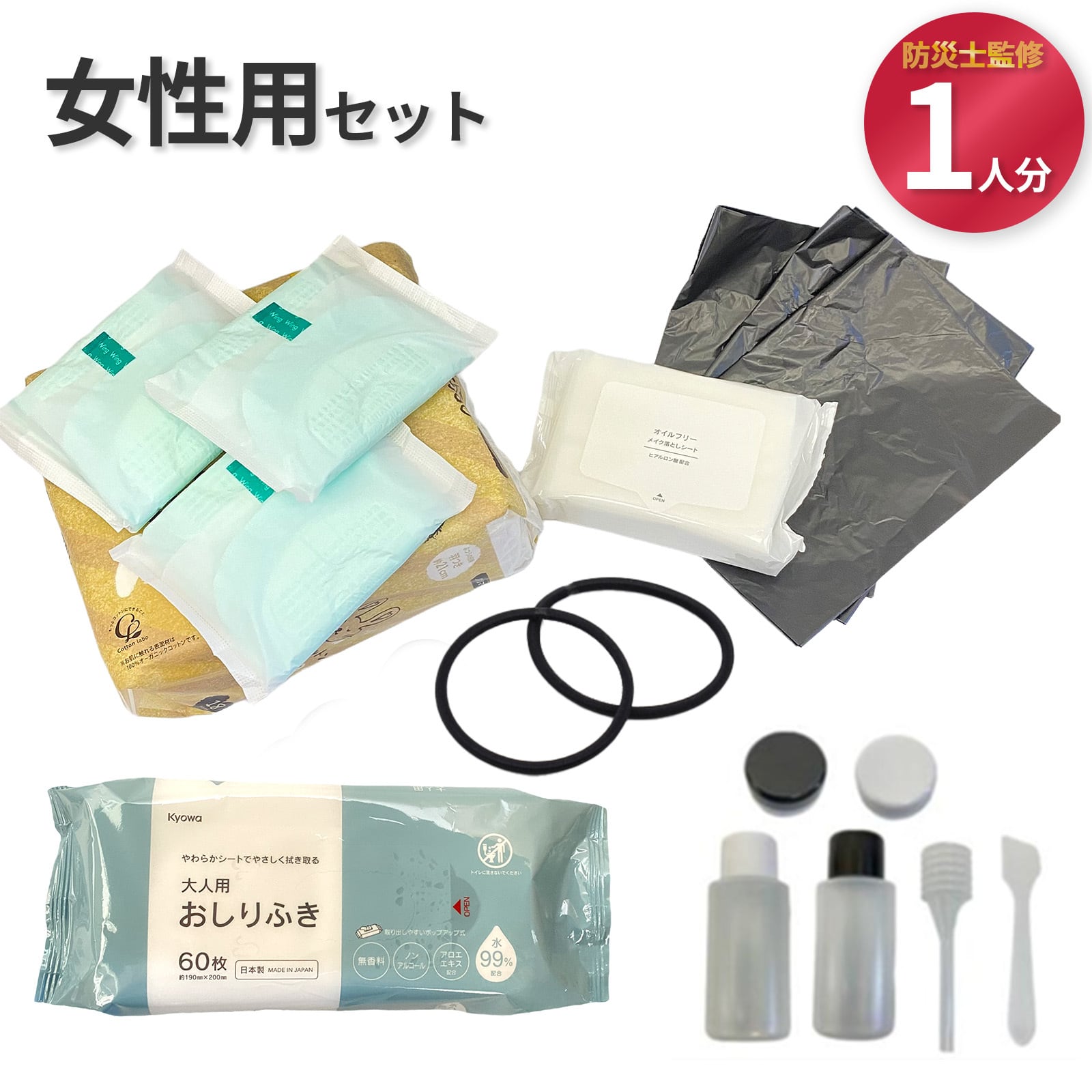 【送料込】防災 女性用セット 【防災士監修】 地震対策 災害 備蓄品 非常持出袋 生理用品 メイク落とし 詰替えボトル ヘアゴム お尻ふき サニタリー袋 防災リュック 防災セット