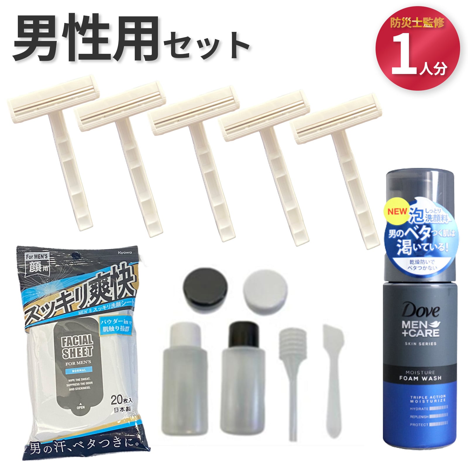 【送料込】男性用セット フェイスケア 4点セット 【プロの防災士監修】メンズ 地震 災害 備蓄品 非常持出袋 汗拭きシート シェービングクリーム 髭剃り 詰替え容器