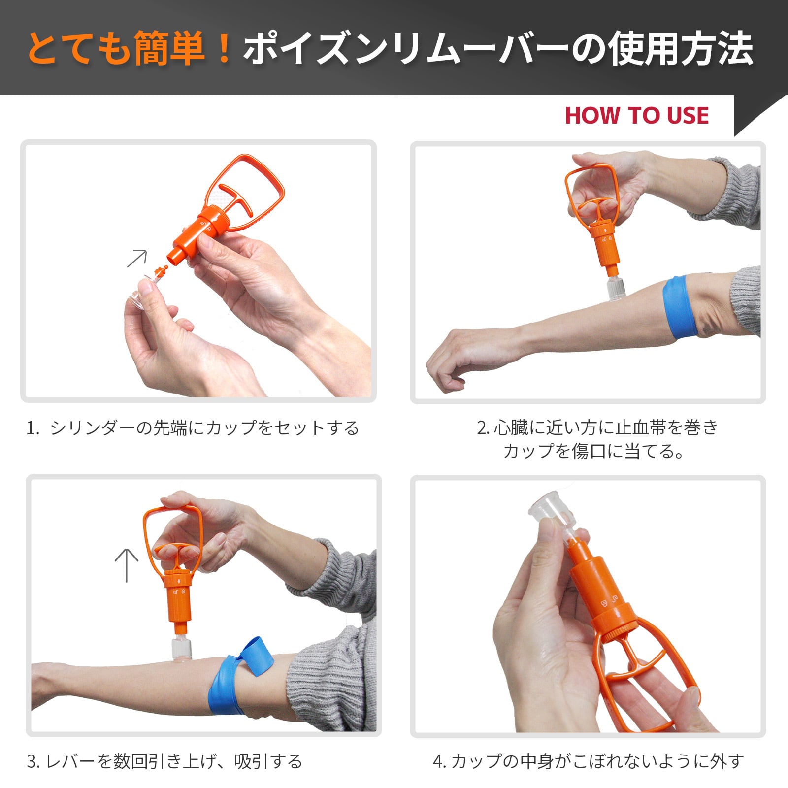 害虫に刺されたりしたときに有害物質を簡単に吸い出せるポイズンリムーバー入り!